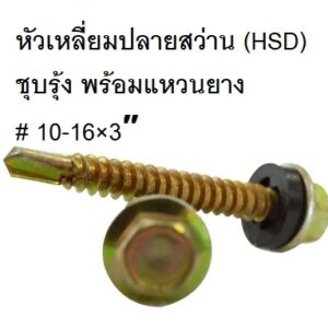 สกรูหัวเหลี่ยมปลายสว่าน (HSD) ชุบรุ้ง พร้อมแหวนยาง # 10-16×3″
