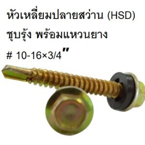 สกรูหัวเหลี่ยมปลายสว่าน (HSD) ชุบรุ้ง พร้อมแหวนยาง # 10-16×4″